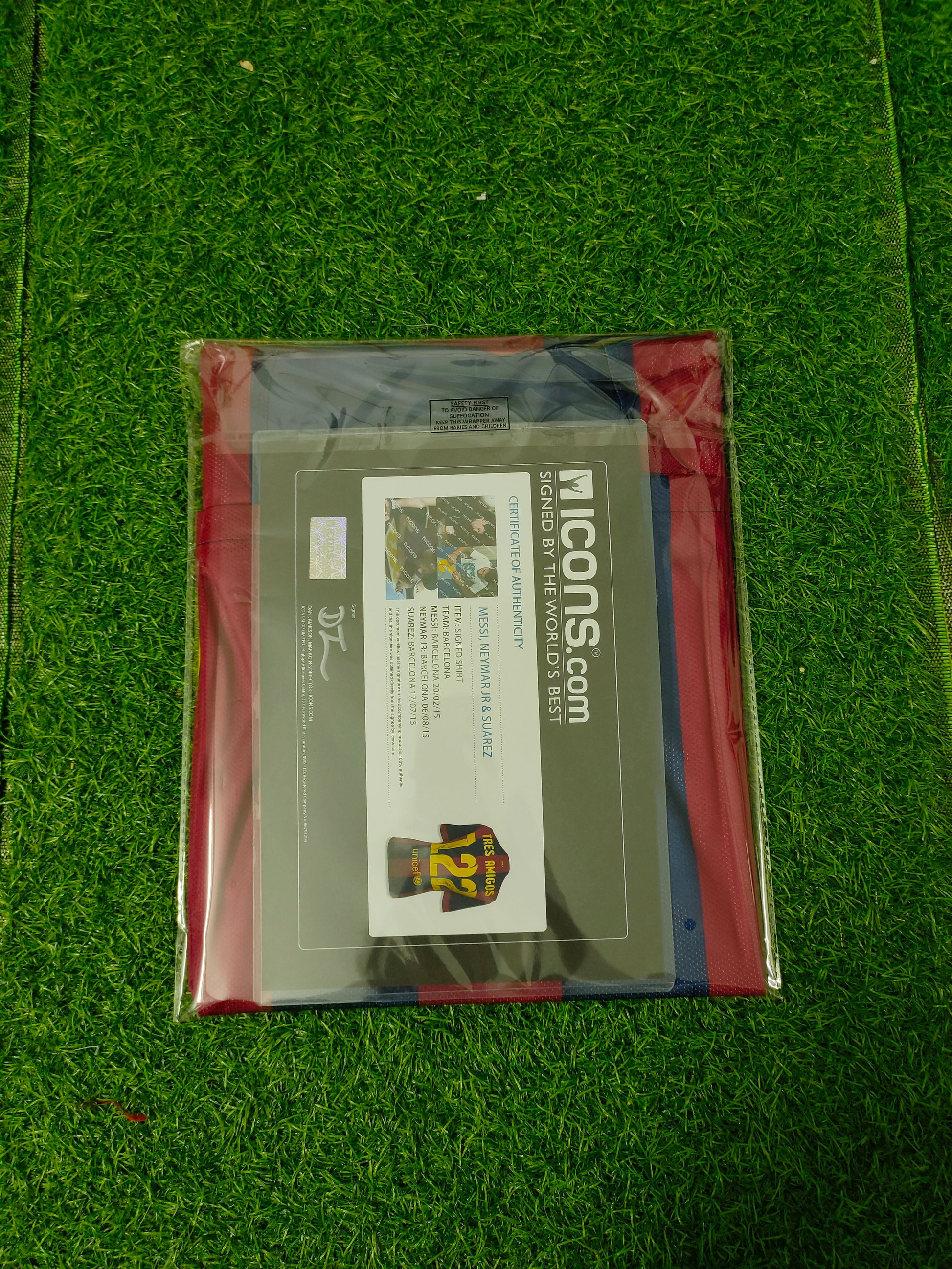 Autograph of Messi, Suárez, and Neymar + ICONS Certificate. All images are authentic.