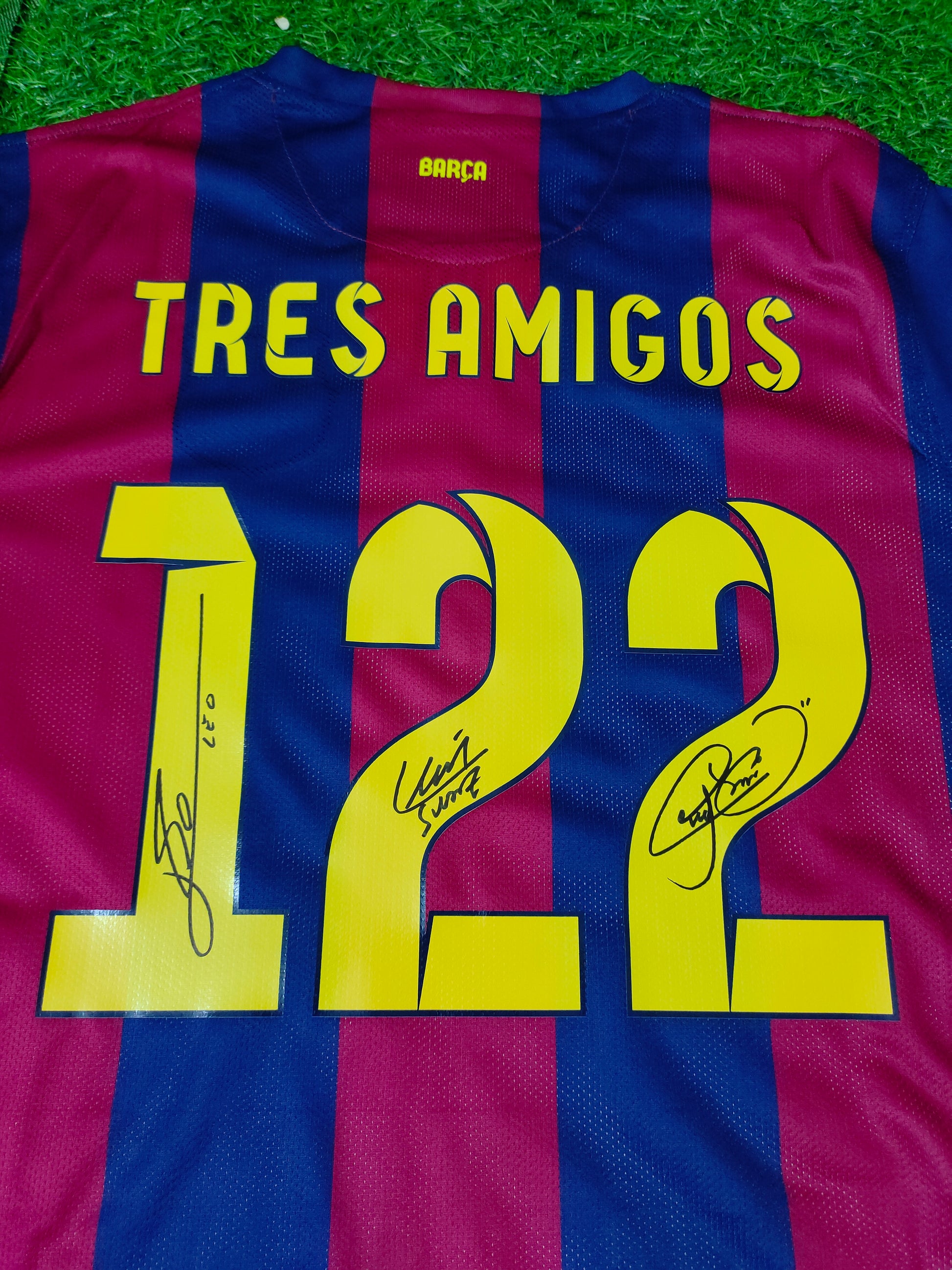 Official authentication: short-sleeved T-shirt with the autograph of Messi, Suárez, and Neymar, fan edition.